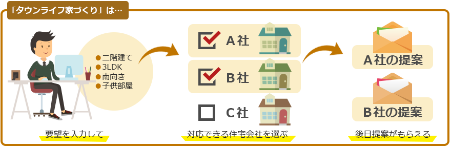 ユーザーは条件を入力するだけで、希望に合った住宅会社・不動産会社の両方から無料で提案を受けられるため、住宅選びの比較・検討が簡単に行えます!